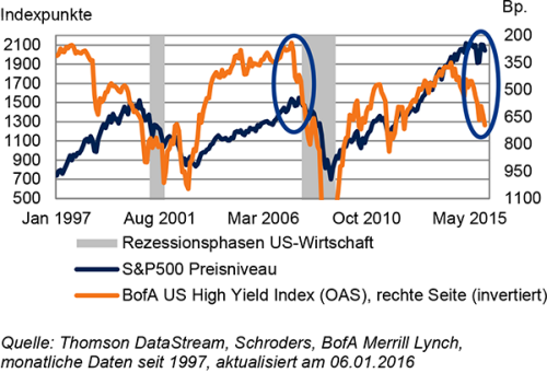 Seit dem vergangenen Jahr sind die Spreads auf US-Hochzinsanleihen aufgrund der energiebedingten und titelspezifischen Risiken gestiegen. Diese höheren Spreads implizieren einen negativen Ausblick; daher erwarten die Anleger eine entsprechende Kompensation, wenn sie dieses zusätzliche Risiko eingehen.