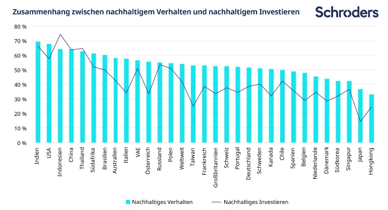 Die Schroders Global Investor Study 2017 zeigt, dass Länder mit einem höheren Prozentsatz verantwortungsvoll handelnder Verbraucher tendenziell auch einen höheren Anteil Anleger haben, die geneigt sind, nachhaltig zu investieren.