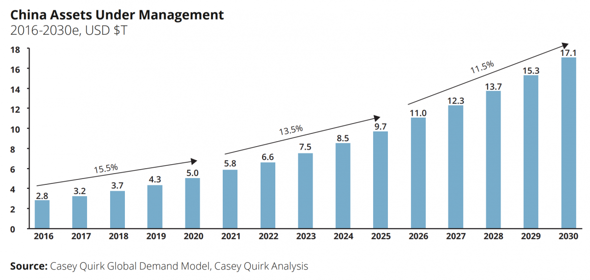 In der Studie “Leadership in Times of Plenty: Future Winners in China’s Asset Management Industry geht die Beratungsgesellschaft Casey Quirk davon aus, dass die jährlichen Wachstumsraten der verwalteten Vermögen bis 2025 bei rund 15 Prozent liegen werden, um dann bis 2030 auf 12 Prozent zurückzugehen. Das, so die Autoren Daniel Celeghin und Natalie Wong, ist gleichbedeutend mit einem Nettomittelzufluss von circa 7,3 Billionen Euro an Assets, die von chinesischen Investoren erworben werden. Das entspräche dem gesamten Mittelzufluss aller anderen globalen Märkte zusammen. Casey Quirk ist eine Tochter der Unternehmensberatung Deloitte und spezialisiert auf die Beratung von Asset-Management-Firmen.