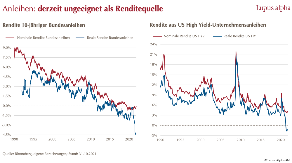 Auch bei US-Hochzinsanleihen sei der Abwärtstrend deutlich zu erkennen. 90 Prozent der US-amerikanischen High Yield-Anleihen rentierten negativ. Unter Berücksichtigung der Inflation seien Anleihen deshalb mittlerweile ungeeignet als Renditequelle. Der Trend sei eindeutig. „In 5000 Jahren waren die Zinsen noch niemals so niedrig. Bis Anfang der 30er-Jahre war der Zins immer positiv“, so Labod. Wie besonders die Situation am Kapitalmarkt sei, lasse sich auch daran erkennen, dass es früher unvorstellbar war, dass die Zentralbanken die größten Aufkäufer von Anleihen sein könnten. Heute nehme man das mit einem Schulterzucken hin. Nun sei eine Wende der Notenbankpolitik kaum noch vorstellbar. Die private Verschuldung in den USA liege zwischen 300 und 500 Prozent. Ein Zinsanstieg sei vor diesem Hintergrund nicht denkbar.