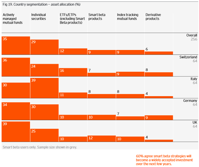 Wichtigste Erkenntnis der Befragung: Der zunächst einstellige prozentuale Anteil von Smart-Beta-Strategien an den Portfolios ist zwar gestiegen, aber nicht in sehr bedeutendem Umfang, da viele Nutzer erst seit kurzem in Smart Beta investieren. Innerhalb der nächsten drei Jahre rechnen die Nutzer aber mit einem deutlichen Anstieg: von 12% des Gesamtportfolios auf 20% in Großbritannien, von 10% auf 19% in Deutschland, von 7% auf 12% in der Schweiz und von 8% auf 14% in Italien.