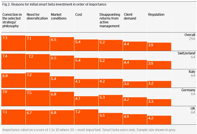 Als wichtigsten Grund für eine Anlage in Smart Beta nennen die Befragten ihre Überzeugung von den Vorteilen der ausgewählten Strategie. An zweiter Stelle folgt die nötige Diversifikation. Insbesondere in Großbritannien spielen aber auch Kostenerwägungen eine wichtige Rolle – eine größere als in Kontinentaleuropa, was an den Vorgaben der britischen Finanzaufsichtsbehörde FCA zur Transparenz von Gebühren und Kosten liegen könnte. Hinter der aktuellen Nachfrage stehen aber vor allem die Bedarfsschätzungen und Empfehlungen der Investmentprofis und weniger die Nachfrage auf Endkundenseite.