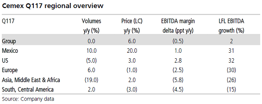 Cemex reported LFL sales of +6% (0% volume; +6% price) and LFL EBITDA growth of +2% (c4% below consensus), leading to slight y/y margin compression of 50bps. For historical price and volume trends, see pages 2-3 of this note.