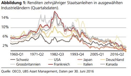 Die letzten beiden Jahrzehnte waren durch ausserordentliche Zinssenkungen in allen grossen Industrieländern geprägt. In jüngster Zeit haben die Finanzkrise und die europäische Staatsschuldenkrise die Zentralbanken veranlasst, weitreichende quantitative Lockerungsmassnahmen (Quantitative Easing, QE) einzuleiten, welche die Renditen auf neue historische Tiefststände getrieben haben.