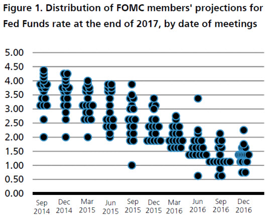 The dot plots charts which follow, suggest Fed members have become slightly more hawkish. This is not necessarily surprising given the recent improvement in economic data, continued advances in employment, and prospects for more expansive fiscal policy going forward.