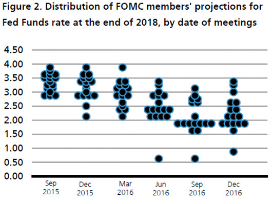 Based on median estimates (Figure 1), Fed members now anticipate three 0.25% rate increases in 2017 - up from the two increases previously projected for next year. They continue to project three rate increases in 2018 as well (Figure 2). The dot plot, which is published after the FOMC meeting, reflects members' opinions on where the fed funds rate should be at the end of the stated period.