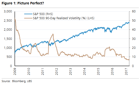 The confluence of an economy that looks poised to grow in 2017 at the Fed's 2.1% estimate (UBSe 2.2%) bolstered by a 2Q tracking near 4% while yields remain low, employment strong and energy prices anchored within a range around $50/bbl. have created ideal conditions for consumers and businesses alike, resulting in all-time highs in the S&P 500 and all-time lows in market volatility (Figure 1).