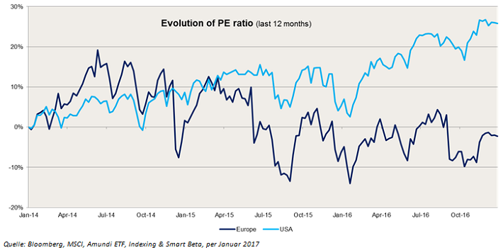 Auch wenn Investoren bei europäischen Aktien vor allem wegen politischer Risiken noch Vorsicht walten lassen, gibt es laut Amundi in diesem Marktsegment positive Entwicklungen, die eine Trendwende möglich erscheinen lassen: zum einen die positive Entwicklung der volkswirtschaftlichen Daten, insbesondere die Erholung des Bruttoinlandprodukts in der Eurozone sowie eine Aufhellung bei Beschäftigung und Konsum. Zudem seien europäische Aktien attraktiv bewertet : Wie in der folgenden Abbildung dargestellt, ist das Kurs-Gewinn-Verhältnis des MSCI Europe im Verlauf der letzten drei Jahre um 2,3 % gefallen – im Vergleich zu einem Plus von 25,8 % für den MSCI USA. Eine mögliche Trendwende könnte in den kommenden Monaten Einstiegsmöglichkeiten für Anleger bieten.