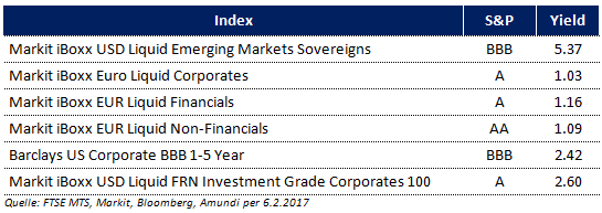 Bei Bond-ETFs lagen in Januar 2017 Schwellenländer-Staatsanleihen mit Zuflüssen von 1,16 Milliarden Euro vorn, gefolgt von High-Yield USA (+610 Millionen Euro) und Unternehmensanleihen aus den USA (+373 Millionen Euro). Die folgenden Tabelle stellt dar, mit welchen Indizes Anleger wieviel Rendite erwirtschaften können.