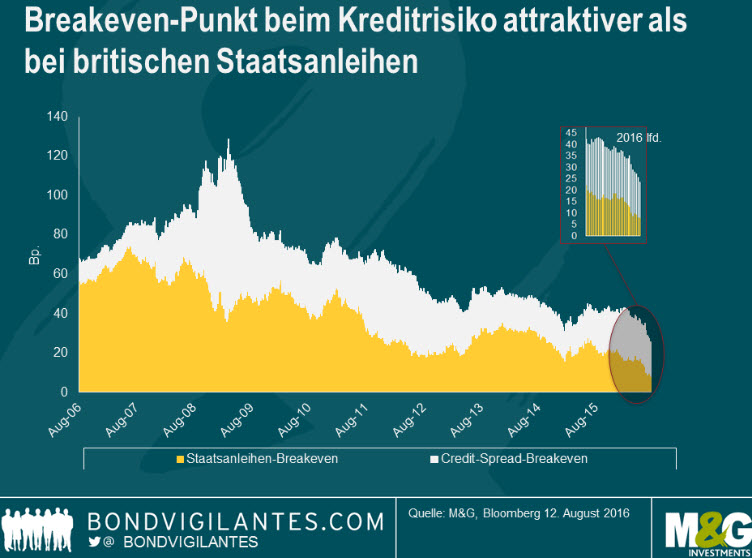 Wenn man eine Unternehmensanleihe erwirbt, kauft man nicht nur das Risiko in Verbindung mit Staatsanleihenrenditen, sondern man kauft damit auch einen Anteil am Kreditrisiko, das durch den Credit Spread reflektiert wird. Der britische Investment-Grade-Sektor weist eine Duration von fast zehn Jahren auf. Demnach setzt man sich dem Risiko der 10-jährigen britischen Staatsanleihe aus, deren Rendite heute bei circa 0,5% liegt. Teilen wir die Rendite durch die Duration der Anleihe, dann erhalten wir eine Breakeven-Rendite oder den Renditeanstieg, den ein Anleger noch tolerieren kann, bevor er dann mit Barmitteln besser bedient wäre. Wie oben dargestellt, beträgt der Renditeanstieg, den ein Anleger in einer 10-jährigen britischen Staatsanleihe (mit einer Duration von neun Jahren) noch tolerieren kann, derzeit etwa 6 Basispunkte (0,5%/Duration von 9 Jahren). Da sich die Renditen für britische Staatsanleihen auf einem Allzeittief befinden, ist auch der Renditeanstieg, der für den Anleger noch akzeptabel wäre, bevor Barmittel lohnenswerter wären, auf einem historisch niedrigen Niveau.