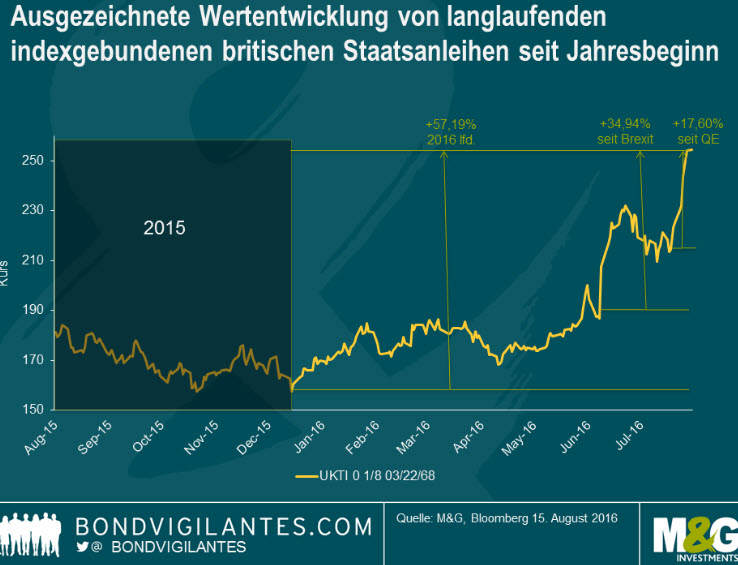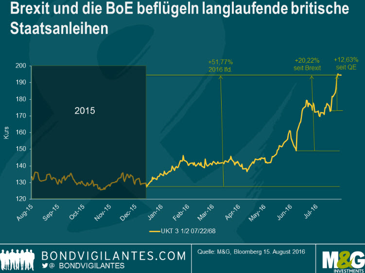 Schauen wir uns an, was bisher im Jahr 2016 bei Staatsanleihen passiert ist. Die ultralange konventionelle britische Staatsanleihe legte dieses Jahr um atemberaubende 52% zu. Seit dem Brexit-Votum stieg der Kurs der Anleihe um 20% und in den wenigen Wochen nach Ankündigung des Stimuluspakets der Bank of England durch Mark Carney erneut um weitere 13%.