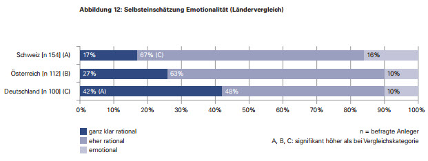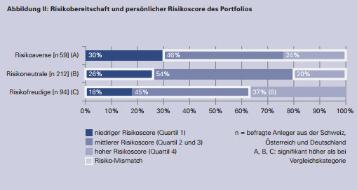 Wichtiges Thema in Zeiten niedriger Zinsen: Emotionalität und Risikobereitschaft. Nur zwölf Prozent der Befragten ordnen sich der Kategorie der emotionalen Investoren zu. Deutschland weise außerdem im Vergleich zu den beiden anderen Ländern einen signifikant höheren Anteil an «ganz klar rationalen» Investoren auf. Dennoch bestehe ein Ungleichgewicht zwischen der individuellen Risikoneigung und dem Portfolio: „Bei rund der Hälfte der Befragten besteht ein Mismatch zwischen individueller Risikoneigung und subjektiver Wahrnehmung des Risikos des eigenen Portfolios. Am häufigsten ist ein Mismatch in Form eines zu hohen oder zu geringen Risikos bei Risikoneutralität des Kunden zu beobachten (rund 25% der Fälle).“