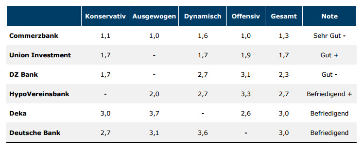„Von 2011 bis 2015 ist das verwaltete Volumen der Branche von 26 Milliarden Euro auf 55 Milliarden Euro gewachsen – eine signifikante Steigerung der Bestände im Jahresvergleich“, berichtet Sälzle. Commerzbank, Union und Deka vereinen dabei 87 Prozent der Gesamtbestände. „Allein von 2014 auf 2015 wächst beispielsweise das Volumen der Union Privatfonds von sieben auf zwölf Milliarden Euro – eine Erfolgsstory.“ Zu den Anbietern, die das Unternehmen unter die Lupe genommen hat, gehören neben der Union Privatfonds (Volumen: rund 12 Milliarden Euro) die Commerzbank Vermögensmanagement (Volumen: rund 21 Milliarden Euro), die Deka Vermögenskonzept (Volumen rund fünf Milliarden Euro), die Deutsche Bank (Volumen: insgesamt rund zwei Milliarden Euro) und die HypoVereinsbank (Volumen: insgesamt rund 4,5 Milliarden Euro). Die Union habe beispielsweise bei den konservativen Anlagen mit der UniStrategie konservativ in Sachen Performance seit 2010 klar die Nase vorn. „Gleichzeitig geht sie aber auch mehr Risiken, wie das Risiko-Rendite-Verhältnis über drei Jahre zeigt, ein.“ Noch besser sei das Risiko-Rendite-Verhältnis der Commerzbank (VM Substanz). Auch bei den ausgewogenen Mandaten kann die Commerzbank mit dem VM Balance in Sachen Performance und Risiko-Rendite-Verhältnis klar überzeugen. Die Analyse dynamischer und offensiver Fonds gebe ein ähnliches Bild wieder: „Union und Commerzbank haben die Nase vorn und überzeugen mit konsistent überdurchschnittlicher Performance.“ Über alle Klassen hinweg zeige vor allem die Commerzbank die besten risikoadjustierten Ergebnisse. „Die Union ist zwar meistens Klassenbester, wenn es um die Performance geht, nimmt dafür aber mehr Risiko in Kauf“, berichtet Sälzle. Dafür gibt es insgesamt die Note sehr gut für die Commerzbank und zwei plus für die Union. Mit einer drei Plus muss sich die HypoVereinsbank begnügen. Die Deka und die Deutsche Bank erhalten eine drei. „Deka und Deutsche Bank bilden das Schlusslicht. Die Deka konnte weder auf Performance- noch auf Risikoseite überzeugen und Vermögensfondsmandate der Deutschen Bank liefern insbesondere auf der Risikoseite ein schwaches Ergebnis gegenüber den Wettbewerbern und der Benchmark.“