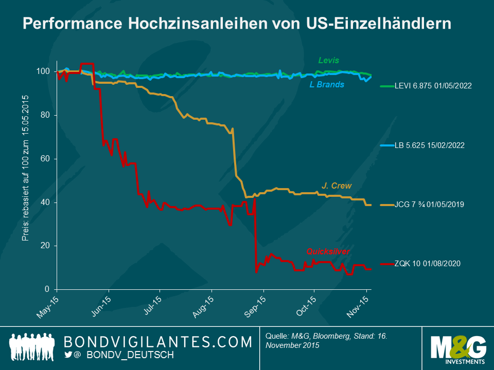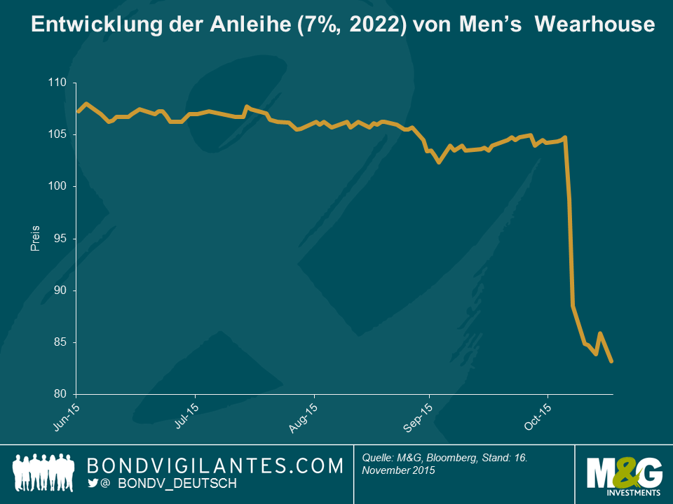 Ein Beispiel für die letztgenannte Kategorie ist Men’s Wearhouse, ein auf Herrenanzüge und Accessoires spezialisierter Einzelhändler: http://www.cnbc.com/2015/11/06/mens-wearhouse-shares-tank-40-percent.html. Der Aktienkurs des Unternehmens ist seit Oktober um nahezu 50% eingebrochen, und seine 7%-Anleihe mit Fälligkeit in 2022 hat um rund 20 Punkte nachgegeben, nachdem das Unternehmen für das dritte Quartal vorzeitig überraschend schlechte Ergebnisse bekannt gab.
