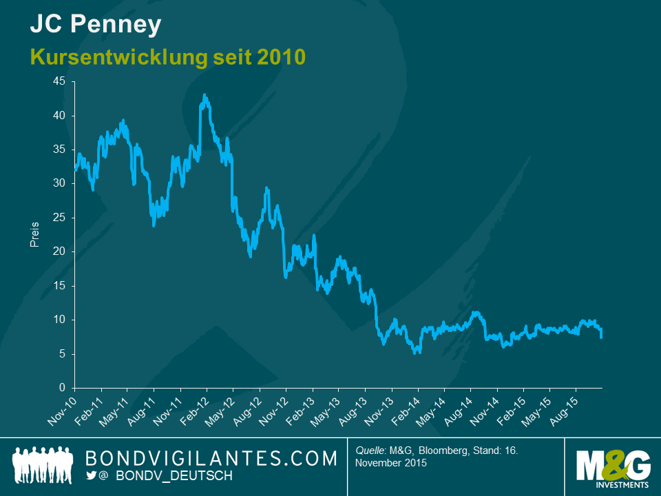 Hinweis: Wir gehen hier auf die Aktie von JCP und nicht auf dessen Anleihen ein, da das Unternehmen im Laufe des Betrachtungszeitraums eine Refinanzierung vorgenommen und seine Kapitalstruktur geändert hat. Die Aktienperformance zeigt somit deutlicher, wie die Erholungsbemühungen von JCP seit Jahren andauern. Das Unternehmen will die Marke wieder aufbauen und Kunden zurückgewinnen.