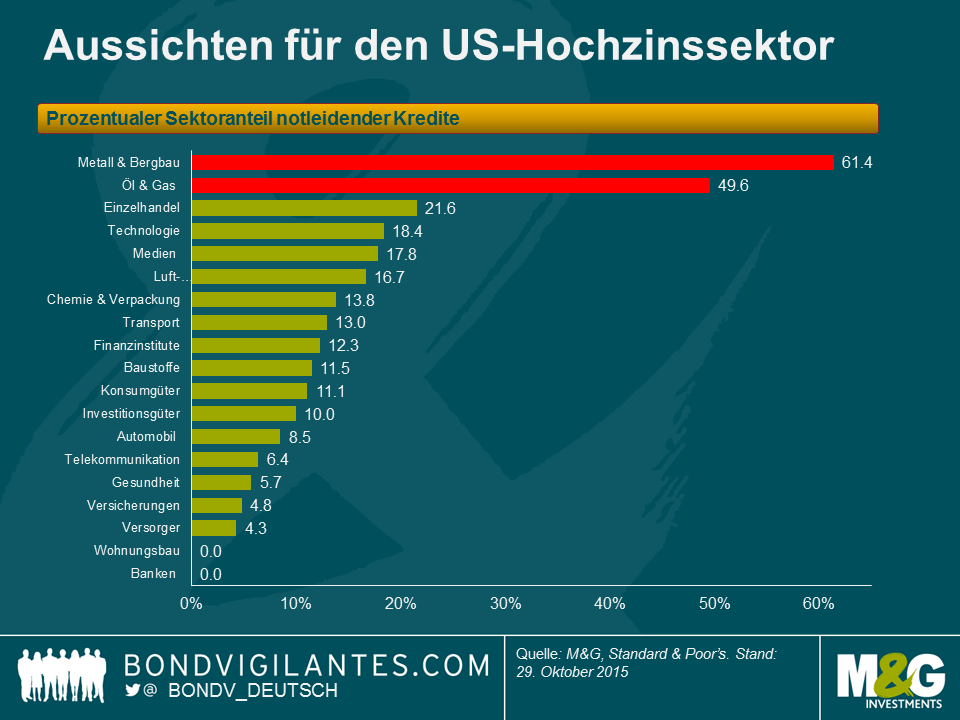 Die Tatsache, dass rohstoffnahe Bereiche wie Metall & Bergbau sowie Energie in diesem Jahr die Sektoren mit der stärksten Verzinsung und der schlechtesten Wertentwicklung waren, überrascht nicht. Aufgrund der derzeit niedrigen Rohstoffpreise gibt es in diesen Sektoren zahlreiche notleidende Kredite. S&P hat kürzlich eine entsprechende Aufstellung der Sektoren mit dem höchsten prozentualen Anteil solcher notleidenden Kredite veröffentlicht (d.h. mit dem höchsten Anteil von Emittenten, bei deren Anleihen der sogenannte „Option-Adjusted Spread“ (OAS) größer als 1.000 ist). Erwartungsgemäß rangieren Metall & Bergbau sowie Energie mit Quoten von 61,4% bzw. 49,6% ganz oben.