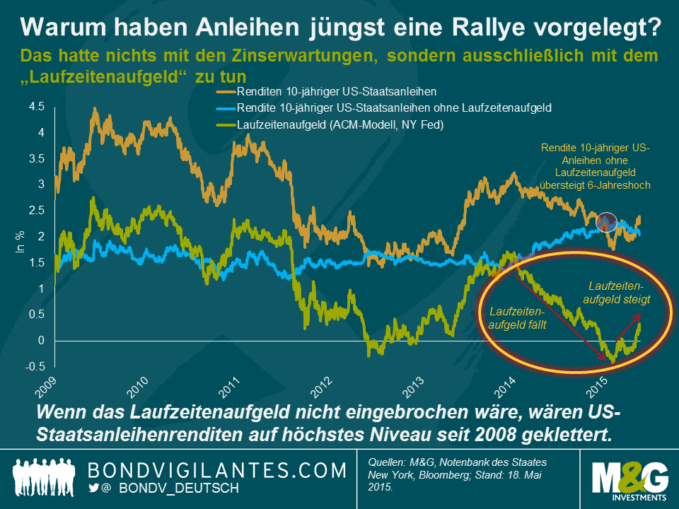 Die Renditen von US-Staatsanleihen mit langen Laufzeiten lassen sich in drei Komponenten aufsplitten: die erwartete Inflation, die Erwartungen hinsichtlich der weiteren Tendenz der Kurzfristzinsen sowie das Laufzeitenaufgeld. Bei der Laufzeitenprämie handelt es sich um die Zusatzrendite, die ein Anleger verlangt, um anstatt in eine Reihe kurz laufender Anleihen in ein Papier mit einer langen Laufzeit zu investieren. Eigentlich würde man davon ausgehen, dass dieses Laufzeitenaufgeld positiv ist. Schließlich sollen die Anleger als Kompensation für die Risiken, die mit Engagements in länger laufenden Anleihen einhergehen (wie etwa eine unerwartete inflationäre Entwicklung oder eine überraschende konjunkturelle Tendenz, Unsicherheit um die zukünftige Zinsstrategie der Notenbank etc.), ja eine Extra-Rendite erhalten. Allerdings ist die Laufzeitenprämie im vergangenen Jahr eingebrochen, und diverse Kennzahlen belegen, dass sie in den ersten Monaten des Jahres 2015 sogar negativ war. Dem ACM-Modell der Notenbank des Staates New York zufolge war die Rallye, die US-Staatsanleihen im Jahr 2014 vorgelegt haben, sogar ausschließlich auf diesen Rückgang des Laufzeitenaufgeldes zurückzuführen, denn wenn dieser nicht gewesen wäre, hätte die Rendite 10-jähriger US-Staatsanleihen im Dezember 2014 ihr höchstes Niveau seit 2008 erreicht. Und wenn die Laufzeitenprämie seit Februar dieses Jahres nicht wieder angestiegen wäre, wären die Renditen von US-Staatsanleihen in den letzten drei Monaten wohl nicht abverkauft worden, sondern hätten vielmehr sogar eine erneute Rallye verzeichnet!