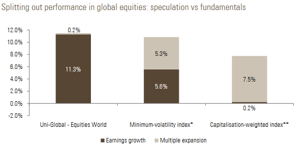 Die Fondsgesellschaft Unigestion wollte es genauer wissen und hat diese Überbewertungsrisiken untersucht. Die Autoren untersuchten, in welchem Maße die Aktienperformance durch den Anstieg der Bewertungskennzahlen und das Gewinnwachstum erklärt werden kann. Bei internationalen Aktien war dieser Anstieg etwa zur Hälfte für die Wertentwicklung des Minimum-Volatilitäts-Index verantwortlich. Die Entwicklung des kapitalisierungsgewichteten Index beruht hingegen fast ausschließlich auf den Bewertungskennzahlen. Für den europäischen Markt ergibt sich ein ähnliches Bild. Hier ist allerdings der Anstieg der Bewertungen nahezu hauptverantwortlich für die Performance des passiven volatilitätsarmen Index. Bei dem kapitalisierungsgewichteten Index spielt im Gegensatz zu den internationalen Aktien das Gewinnwachstum ebenfalls eine Rolle, wenn auch eine untergeordnete.