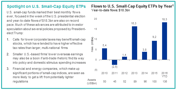 Der Grund für den guten November hat der Studie zufolge einen Namen: Nach dem überraschenden Sieg von Donald Trump bei den US-amerikanischen Präsidentschaftswahlen wurden die Zuflüsse vor allem von US-Aktien-ETFs angetrieben. Die Zuflüsse bei US-Aktien waren sowohl bei Small Caps auf Rekordniveau zu verzeichnen, im Finanzsektor und bei Industriewerten, aber auch bei Large Caps – getragen von der Hoffnung auf neue Anreize und eine vorteilhafte Politik des designierten neuen US-Präsidenten. Gerade LLarge Caps im Finanzsektor profitierten offensichtlich von einer steileren Zinskurve und den Erwartungen auf eine geringere Regulierung unter einer Trump-Regierung.