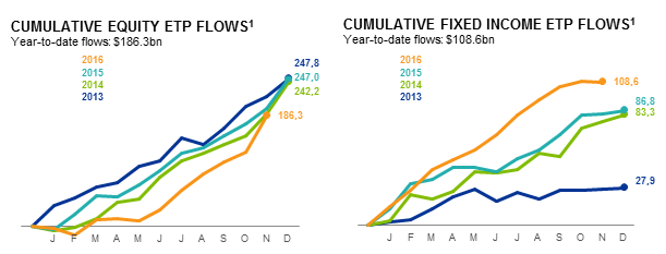 Nur noch wenige Tage, dann werden die Emittenten passiver Investments erneut den Abschluss eines Spitzenjahres feiern können. Denn auch im November sammelten ETPs so viel Geld ein wie selten zuvor. Mit der Rekordsumme von 56 Milliarden US-Dollar war der November der beste Monat seit Dezember 2014. Das zeigt eine aktuelle Statistik des BlackRock Investment Institut.