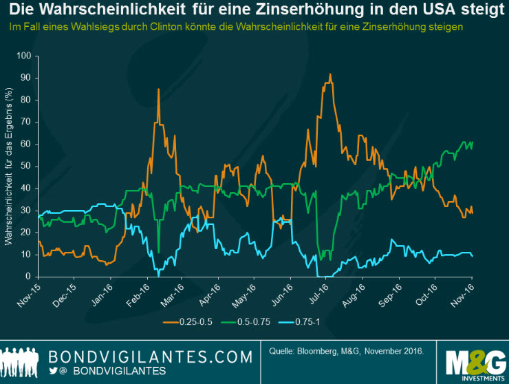 Die Märkte erachten einen Sieg von Clinton als Fortsetzung des gegenwärtigen politischen Umfelds in den USA, vor allem wenn die Republikaner die Kontrolle über das Repräsentantenhaus behalten. Gemessen an der Preisvolatilität wäre dies wohl das günstigste Szenario für die Renten- und Devisenmärkte. Nach einem Wahlsieg durch Clinton dürfte der Rentenmarkt eine höhere Wahrscheinlichkeit für eine Veränderung des Zinsniveaus einpreisen, da das Ende der wahrgenommenen politischen Unsicherheit den Weg für eine Zinserhöhung durch die US-Notenbank Fed im Dezember ebnet. Von der unmittelbaren Veränderung des Preisniveaus an den Märkten dürfte hauptsächlich der US-Dollar profitieren, vermutlich werden jedoch sämtliche Gewinne berücksichtigt.