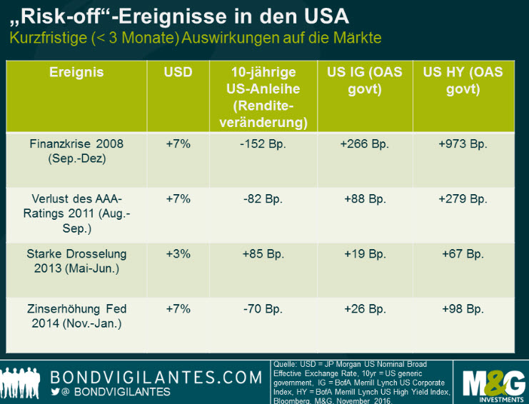 Aufgrund der Ungewissheit über die Folgen für die US-Wirtschaft würde ein Sieg durch Trump zu einer erhöhten Volatilität an verschiedenen Märkten führen. Nach Bekanntwerden des Ergebnisses dürfte die Risikoaversion zunehmen, was zu einem Anstieg des US-Dollar, niedrigeren Anleihenrenditen und einem schwächeren Markt für US-Hochzinsunternehmensanleihen führen würde. Im Universum für festverzinsliche Anlagen würden Schwellenmarktanleihen und -währungen aufgrund der kompromisslosen Haltung Trumps mit Blick auf China und Mexiko am stärksten leiden. Die entsprechende Marktreaktion könnte ähnlich aussehen wie bei vorherigen Ereignissen, bei denen Marktteilnehmer risikobehafteten Anlagen den Rücken kehrten, wie beispielsweise der Finanzkrise im Jahr 2008, dem Verlust des AAA-Ratings der US-Regierung im Jahr 2011 und der starken Drosselung im Jahr 2013. Die Marktreaktion infolge eines Wahlsiegs durch Trump könnte die Fed von einer Zinserhöhung im Dezember abhalten. Andernfalls, würde die Fed in einer unsicheren politischen Lage und Marktumfeld eine Anhebung des Zinsniveaus weiter verfolgen, könnte es zu unerwünschten Reaktionen an den Märkten kommen, ähnlich wie bereits im Jahr 2014.