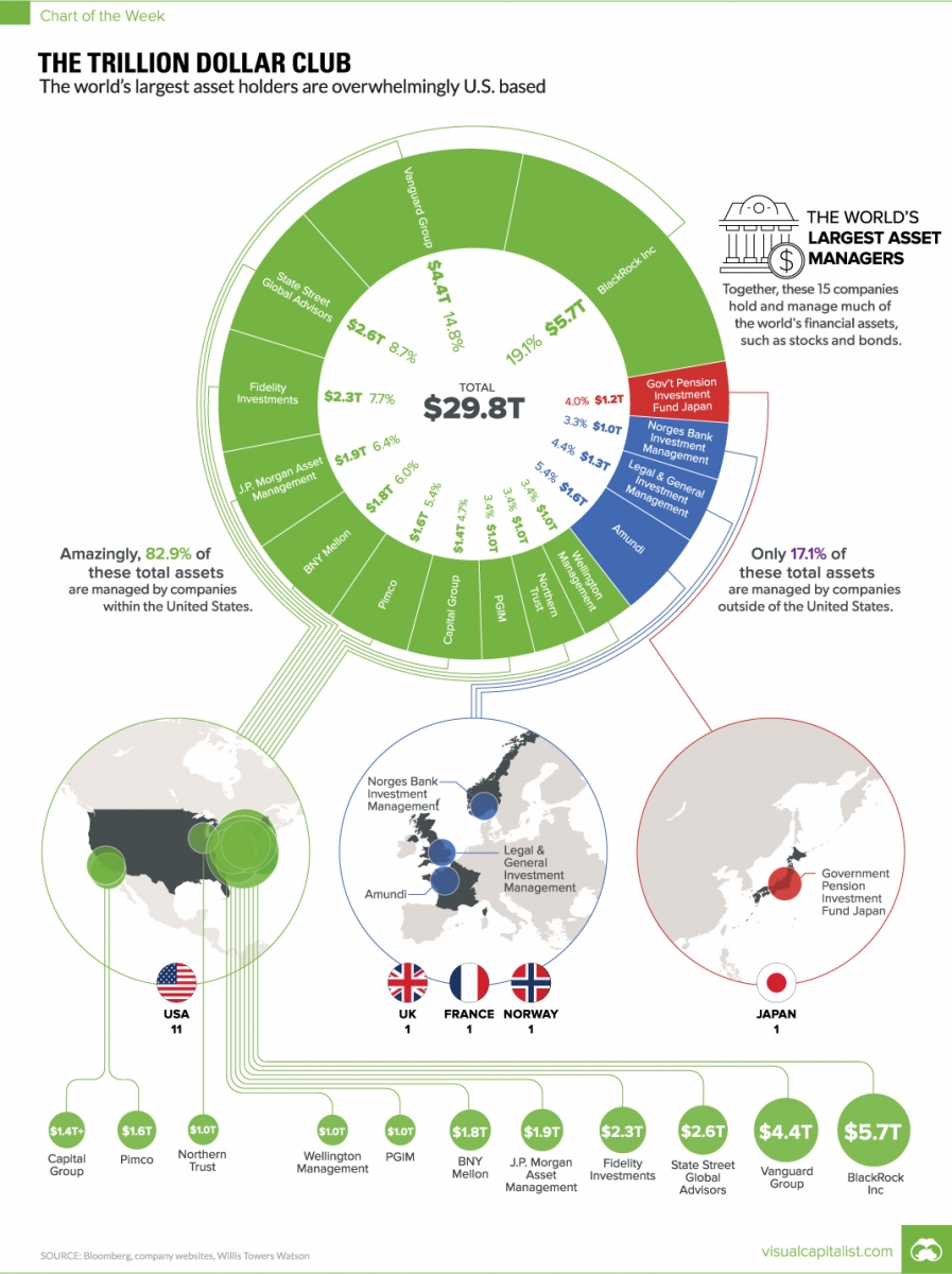 Außer Northern Trust (Chicago), Pimco (Newport Beach), und der Capital Group (Los Angeles) haben übrigens alle verbleibenden acht Gesellschaften ihren Sitz in New York City – entweder an oder in unmittelbarer Nähe der Wall Street.