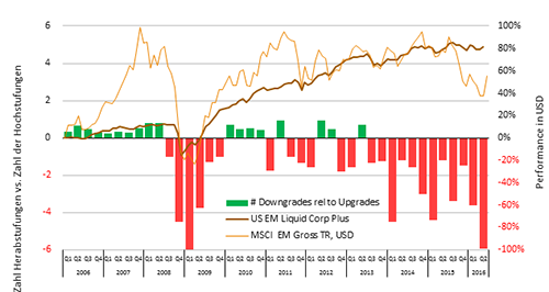 Während an der Oberfläche die Spannungen in den Emerging Markets abnehmen, brodeln darunter Sorgen über die Situation an den Kreditmärkten. So zeigen die Anleihenrenditen von Qualitätsemittenten nahezu keine Bewegung nach oben. Dagegen beobachten wir derzeit einen deutlichen Anstieg der Zahl der Herabstufungen der Ratings von EM-Unternehmen.