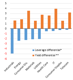 Grafik 2 zeigt, dass Aktien in der WisdomTree Emerging Market Equity Income Strategie (Ticker: DEM) im Vergleich zu unserem Anlageuniversum mit EM-Unternehmensanleihen ein niedrigeres Verhältnis zwischen Nettoverschuldung und EBITDA aufweisen und gegenüber dem EM-Anleiheuniversum höhere Renditen erzielen. Dabei beschränken sich die niedrigere Fremdkapitalaufnahme und das höhere Renditeniveau nicht etwa auf bestimmte, ausgewählte Aktien. Vielmehr wird in der Grafik deutlich, dass sich diese Entwicklung auf alle Branchen außerhalb des Finanzsektors erstreckt. Hinzuweisen ist auf den niedrigeren Verschuldungsgrad der im WisdomTree EM Equity Income ETF vertretenen rohstoffbasierten Titel, beispielsweise von Unternehmen der Grundstoffindustrie und des Energiesektors. Für diese ist ein Verhältnis Nettoverschuldung/EBITDA von 1,8 bzw. 1,9 dokumentiert; sie liegen damit deutlich unter den für liquide EM-Unternehmensanleihen verzeichneten Werten von 5,5 bzw. 5,7. Zwar entfällt ein Großteil der hohen Verschuldung in unserem Universum mit EM-Unternehmensanleihen auf die wiederholte Emission großer Anleihetranchen durch PEMEX (Petroleos Mexicanos). Allerdings liegt das durchschnittliche Verhältnis Nettoverschuldung/EBITDA selbst bei Herausrechnung von PEMEX aus den Anleihen der Energiebranche bei 3,8 und damit erheblich über dem des WisdomTree Equity Income ETFs. Der im Nichtfinanzbereich verzeichnete Renditeaufschlag spiegelt die Abwertung der Large-Cap-Aktien in den Emerging Markets im Zuge der Talfahrt der Rohstoffpreise im März dieses Jahres wider. Zumindest im Anlageuniversum des WisdomTree Emerging Market Equity Income ETFs kam es paradoxer Weise dazu, dass eine Übergewichtung von Rohstoffexporteuren einigen Unternehmen dazu verholfen hat, ihre Dividendenkürzungen zu begrenzen. Möglich wurde dies durch die deutliche Abwertung der Währung und die sich daraus ergebende Verbesserung ihrer Exportchancen und Wahrung der in US-Dollar generierten Erlöse.