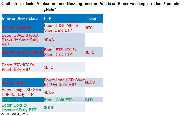 Kurzfristig bieten sich aus taktischer Sicht zahlreiche Chancen Anleger sollten gut vorbereitet sein: Kurzfristig wird sich die Volatilität fortsetzen, weshalb eine Absicherung breit gestreuter Anlagen in Aktien geboten ist und gegebenenfalls ein Rückzug in sichere Häfen wie Gold erwogen werden sollte. Aus unserer Sicht dürfte ein „Nein“ zur Renzi-Reform zu einem wachsenden Einfluss der euroskeptischen Haltung Grillos führen. In der Folge könnte es kurzfristig zu einem Ausverkauf an den Aktienmärkten kommen. Eine Verschlechterung der Haushaltslage und die politische Ungewissheit dürften sowohl bei Anleihen als auch bei Euro-Engagements eine Verkaufswelle nach sich ziehen.