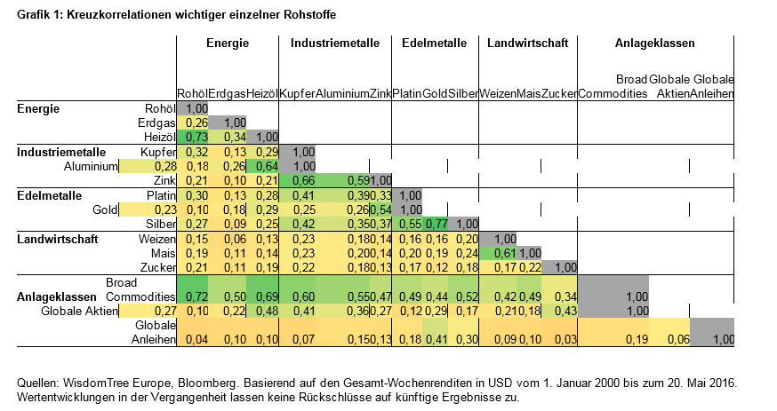 Die Tabelle belegt beispielsweise, dass zwischen Weizen- und Erdgasfutures die niedrigste, nahe Null liegende Korrelation besteht. Zwischen Erdgas und Kupfer zeigt sich eine Korrelation von rund 0,13 und zwischen Erdgas und Gold beträgt sie 0,11. Die Kupfer-Gold-Korrelation beläuft sich auf 0,29, die Kupfer-Mais-Korrelation auf etwa 0,2. Gold und Mais kommen auf eine Korrelation von 0,19. Innerhalb der Rohstoffsektoren ergeben sich zwar höhere Korrelationen. Werte von 0,6 bis 0,7 implizieren jedoch, dass eine Kombination von Heizöl mit Rohöl, Zink mit Kupfer, Silber mit Gold oder Weizen mit Mais dennoch die Volatilität reduziert.