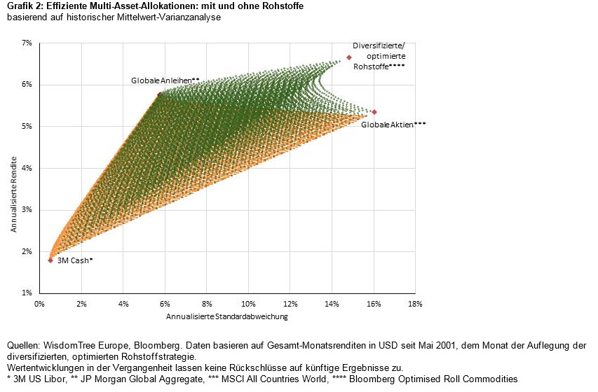 Eine diversifizierte Rohstoffanlage kann in Verbindung mit einer verbesserten/optimierten Rollstrategie das Performanceprofil von Multi-Asset-Portfolios positiv beeinflussen. Grafik 2 zeigt unter Anwendung der Markowitzschen Portfoliotheorie der Mittelwert-Varianzanalyse, wie die Umsetzung einer solchen Anlagestrategie für Rohstoffe das Performanceprofil eines Multi-Asset-Portfolios aus globalen Aktien und Anleihen sowie Cash optimieren kann[5]. Die orange dargestellten Punkte entsprechen Anlagen in globale Aktien, Anleihen und Bareinlagen. Diese hätten Investoren bei identischem Risikograd niedrigere Renditen als bei Ergänzung des Portfolios durch eine Allokation in eine breite, diversifizierte Rohstoffstrategie eingebracht, die in dieser Darstellung durch den EBCIWTT repräsentiert ist. Die grünen Punkte zeigen, dass bei gegebenem Risikograd durch eine in gewissem Umfang vorgenommene Allokation in die diversifizierte, optimierte Rohstoffstrategie eine höhere Portfoliorendite erzielt werden konnte.