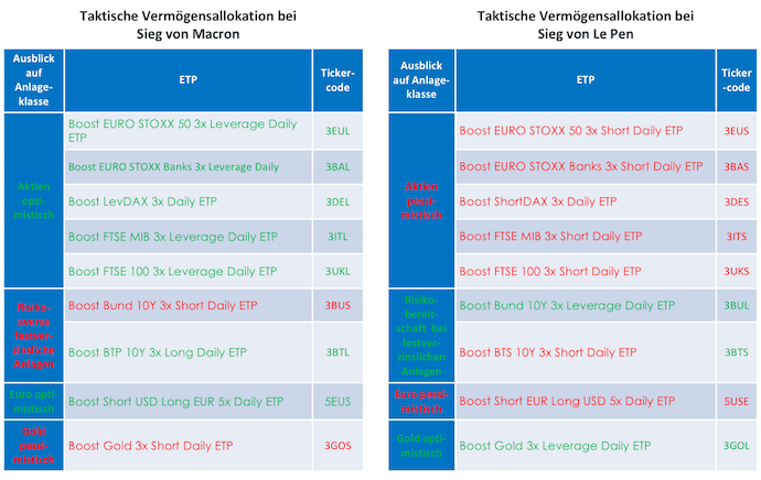 In den Tabellen unten werden unsere wichtigsten taktischen und strategischen Sichtweisen zur zweiten Runde der Wahlen in Frankreich anhand des Boost ETP- und UCITS ETF-Angebots, das Anleger in Betracht ziehen sollten, zusammengefasst: