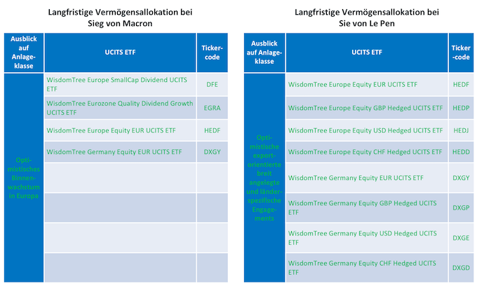 Im Gegensatz dazu würde ein überraschender Sieg Le Pens sowohl die Selbstzufriedenheit der Märkte als auch Risikoaktiva abstrafen. Die wachsende politische Unsicherheit und der Druck auf den Euro würden zu neuen Chancen für breit angelegte oder länderspezifische exportorientierte Aktien führen.