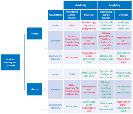 Eine strategische Positionierung für einen Sieg Trumps könnte auf ein Engagement in Aktien von US-Small Caps setzen, um die Erwartungen eines höheren Binnenwachstums zu nutzen. Wenn hingegen Clinton die Wahl gewinnt, könnte ein langsameres Binnenwachstum Anleger veranlassen, auf Aktien von exportorientierten Unternehmen setzen oder sich defensiver in Unternehmen mit hohen Dividenden zu positionieren. Außerdem besteht die Möglichkeit, US-Aktien unterzugewichten oder sich von ihnen abzuwenden und europäische Exporttitel in Betracht zu ziehen, die stärker von einem Wahlsieg Clintons profitieren dürften.