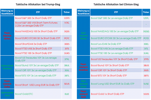 Abbildung 2 fasst unsere Meinung bei taktischen Positionen rund um einen Sieg Trumps oder Clintons anhand der wichtigsten Short- und Leveraged-ETPs zusammen.