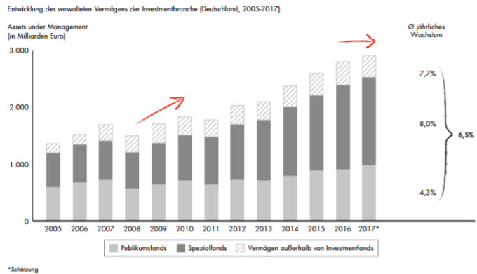 Im Fokus vieler Fondsgesellschaften stehen weniger die privaten Anleger, als die institutionellen. Das schlägt sich sowohl in der Höhe der Assets under Management als auch in den Nettomittelzuflüssen nieder. Während Spezialfonds gut 1,5 Bio. Euro betreuen, beträgt das kumulierte Volumen deutscher Publikumsfonds nur gut 975 Mrd. Euro. Im Schnitt liegen die jährlichen Zuwachsraten der Spezialfonds doppelt so hoch, wie die der Publikumsfonds.