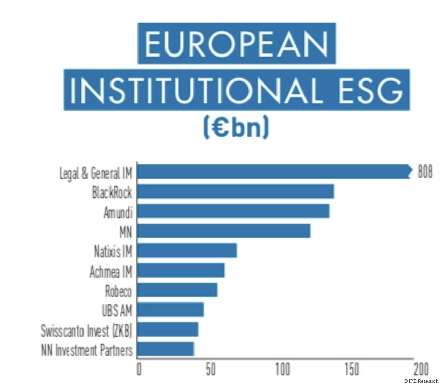 Geht es um nachhaltige ESG-Investments (Environment, Social, Governance) in Europa, spielen US-Anbieter (mit Ausnahme von Blackrock) kaum eine Rolle. Auf dem alten Kontinent hat sich Legal & General IM mit einem verwalteten Vermögen von von 808 Milliarden Euro an der Spitze der Vermögensverwalter etabliert. Dahinter folgen mit deutlichem Abstand Blackrock und Amundi.