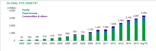 Insgesamt wurden weltweit in ETPs 3,36 Billionen US-Dollar verwaltet. Ende 2015 waren es noch 2,96 Billionen US-Dollar und vor einem Jahrzehnt, also Ende 2006, gerade einmal 598 Milliarden US-Dollar.
