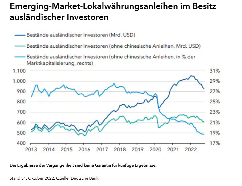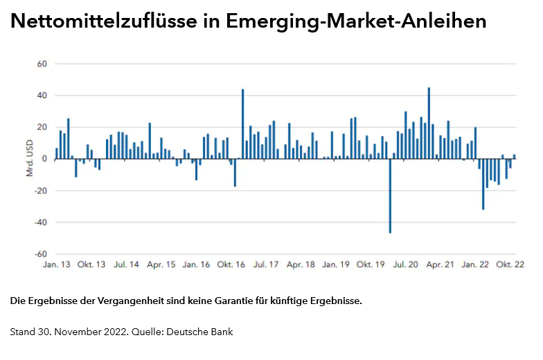 Für die hohen Abflüsse im letzten Jahr gab es viele Gründe: die steigenden US-Zinsen, die höhere Inflation in den Schwellenländern und der generelle Anstieg der Risikoprämien machten Emerging-Market-Anleihen für internationale Investoren unattraktiver. Zugleich stiegen die Finanzierungskostenfür Emittenten von Hartwährungsanleihen. Insgesamt wurden in den ersten elf Monaten des Jahres netto knapp 100 Milliarden US-Dollar aus Emerging-Market-Anleihen abgezogen.