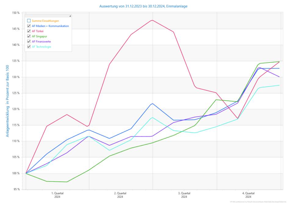 Welche Fondskategorie hatte 2024 die Nase vorne? Ad hoc eine Antwort darauf zu haben, dürfte nicht jedem leicht fallen. Nein, Technologiefonds waren es nicht. Auf dem Siegertreppchen finden sich hingegen die Türkei-Fonds wieder. Trotz hoher Inflation und schwacher Währung haben sich türkische Aktien 2024 am besten entwickelt. Zwar sank im Dezember die Inflation den sechsten Monat in Folge und erreichte den tiefsten Stand seit Sommer 2023. Die Preise steigen aber zum Vorjahresmonat immer noch um 44,4 Prozent. Dass Sachwerte wie Aktien in Zeiten hoher Inflation einigermaßen stabil sind, lässt sich daran gut belegen.