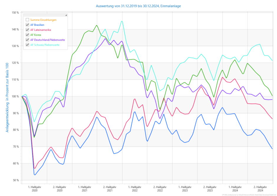 Interessant ist auch ein Blick auf die Flop-Kategorien 2024. Am schlechtesten entwickelten sich Aktienfonds aus Brasilien (-26,8 %) und Lateinamerika (-22,5%). Letztere bestehen meist auch zum Großteil aus brasilianischen Aktien. Mit einem Verlust von 13,6 Prozent belegte Korea den 3. Platz unter den schlechtesten Fondskategorien. Im laufenden Jahr hat sich jedoch in Korea das Blatt gewendet. Rund sieben Prozent haben die koreanischen Aktien 2025 schon zugelegt. Damit ist Korea in diesem Jahr der beste Markt.