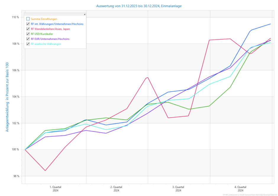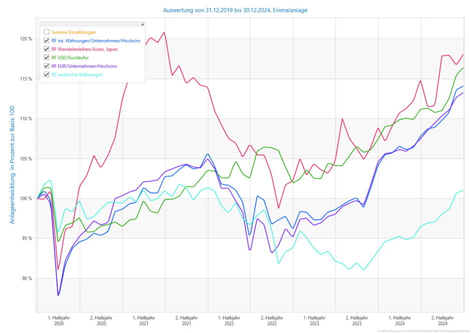 Die Rentenpeergroups konnten sich 2024 nicht unter den besten platzieren. Am besten abgeschnitten haben die Kategorien Rentenfonds int. Währungen/Unternehmen/Hochzins (9,58%), Rentenfonds Wandelanleihen/Asien, Japan (8,42%), Rentenfonds USD/Kurzläufer (8,38%), Rentenfonds EUR/Unternehmen/Hochzins (8,32%) sowie Rentenfonds asiatische Währungen (8,16%).