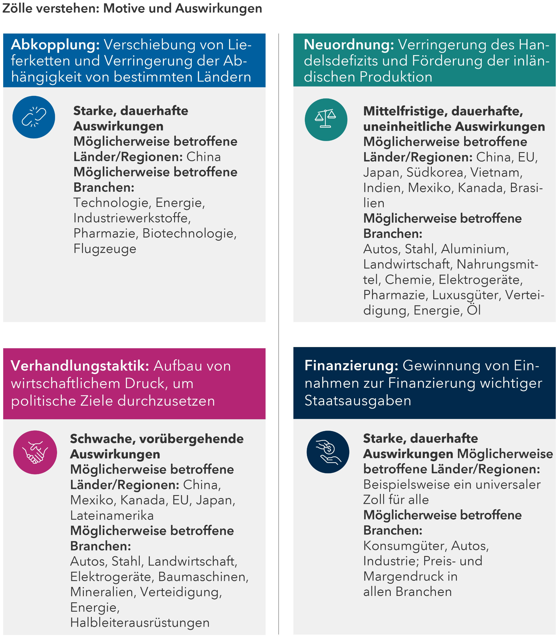 Diese vier Motive bestimmen auch die Auswirkungen auf die Weltwirtschaft. So dürften Zölle, die aus taktischen Gründen erhoben werden, vermutlich nicht von langer Dauer sein. Hingegen könnten Zölle, die einen umfassenden Abkopplungsprozess unterstützen sollen, lange in Kraft bleiben.