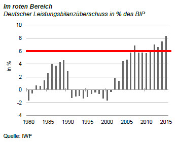 Die anderen finden es schlecht, weil Deutschland damit auf Kosten der Defizitstaaten lebe. In der EU wird die rote Linie bei 6 % des BIP gezogen. Alle Überschüsse, die darüber hinaus gehen, gelten als zu hoch und sollen zurückgeführt werden. Die Bundesrepublik wird daher vermutlich wieder einen "blauen Brief" aus Brüssel bekommen. Außerhalb der EU gehören die Amerikaner – die traditionell Fehlbeträge in den laufenden Posten auf-weisen – zu den größten Kritikern der deutschen Haltung.