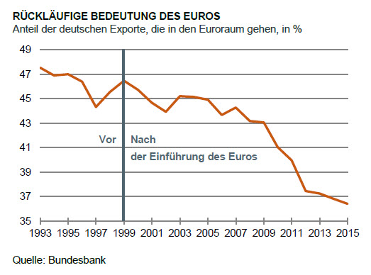 Zum Nachdenklichen bei den Zahlen: Schauen Sie auf die Grafik. Seit Jahren geht der Anteil der Mitglieder der Europäischen Währungsunion an den deutschen Exporten zurück. Das war in gemäßigter Form schon vor der Gründung des Euros der Fall. Es hat sich während der Eurokrise aber dramatisch beschleunigt. Von 2009 bis 2012 ist der Anteil um sechs Prozentpunkte nach unten gegangen. In den letzten Jahren war es dann nicht mehr ganz so schlimm. Der Trend zeigt jedoch unverändert nach unten.