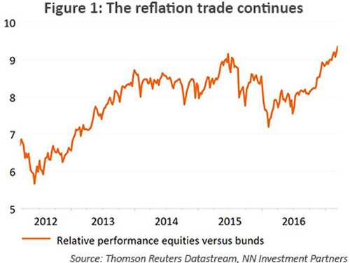 Especially the rate-sensitive assets like government bonds, spread products and real estate posted declines in the past few days – until yesterday. Commodities were hit by a drop of almost 10% in the oil price on news that OPEC compliance is weak and crude oil inventories had risen. Equities, although they were down primarily because of adverse currency movements, resisted well. Especially the Eurozone and Japan posted relatively strong performances. In our view, this is an indication that the reflation trade is still in place. A reflation trade can be defined as the outperformance of asset classes positively correlated with rising interest rates versus negatively correlated assets. In its purest form, it is the return on equities versus the return on safe treasuries. Figure 1 illustrates investors' preference for this trade. Of course, big regional divergences exist due to differences in policy setting, political uncertainty and the point in the economic cycle. The US is much more advanced in this reflation trade, whereas in the Eurozone it is still in an early stage.