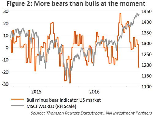 Still, there are no broad-based signs of excessive optimism visible as fears over political shocks linger. Investor cash levels remain high and investor sentiment has come down from its elevated levels at the start of the year. In the US, the bull/bear indicator of private investor sentiment has fallen to its lowest level since February 2016 (see Figure 2), when many other negatives were present. This bearish reading coincided exactly with the low of the market. We think this caution is partially linked to political uncertainty and the ebb and tide of this will determine the short term direction of the market.
