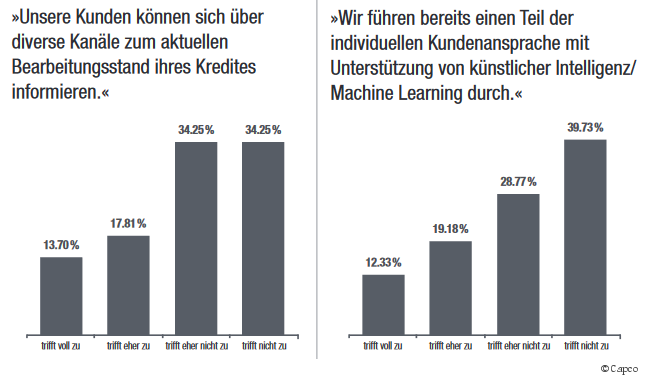 Banken verfügen zum Großteil nicht über effiziente, integrierte IT-Systeme. Lediglich acht Prozent der Banken nutzen bereits IT-Systeme, die im Kreditprozess gänzlich integriert sind und keine redundante manuelle Eingabe von Daten benötigen. Nur eine Minderheit gleicht diesen Zustand gegenwärtig durch den Einsatz von Robotic Process Automation (RPA) aus. Lediglich ein knappes Drittel nutzt die Automatisierung im Kreditprozess. „RPA eignet sich vor allem als Brückenlösung hin zu einer vollumfänglich integrierten Systemlandschaft. Die Altlasten sind teilweise dramatisch - rund 35 Prozent verwenden weiterhin Papierakten anstelle einer digitalen Ablage“, erklärt Capco-Partner Oliver Geiseler.