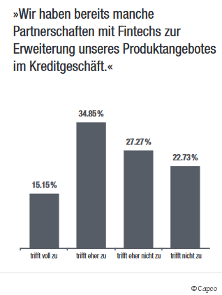 Trotz der zahlreichen technischen Herausforderungen im Backend der Institute, sind Banken sehr aufgeschlossen für den Austausch mit innovativen Drittanbietern (Fintechs). Rund 55 Prozent der Befragten nutzen die Potentiale von Kooperationen im direkten Kundenkontakt, um das Produktangebot im Kreditgeschäft zu verbessern. Diese und andere Services tragen zu einer höheren Produktvielfalt im